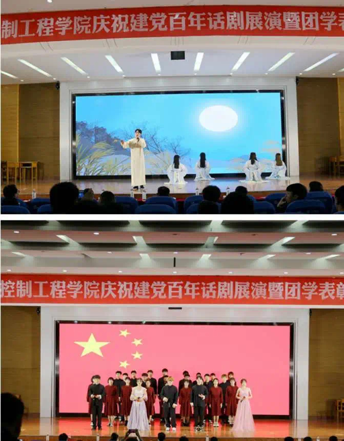 活动主要分两个部分,话剧展演和表彰先进,期间学院在校经典诵读比赛中获奖作品《蒹葭》、《少年中国说》展演及党史问答互动穿插其中,内容丰富,主题鲜明,各支部党员、入党积极分子参与其中,氛围热烈。学生第一支部的话剧《忆五四 创青春》致敬历史的同时号召电气学子应时刻以饱满斗志把握青春,以优异成绩献礼建党百年;第二支部以话剧《自救》再现历史场面,弘扬了共产党人敢于斗争的勇气,引导广大学子敢于突破自我,敢于迎难而上;第三支部以《黎明》命名话剧,讲历史,“书血书”,更邀请支部往届优秀毕业生党员“现身”分享,为在校学子树立良好标杆;第四支部的话剧《破晓》,以细节再现历史,用他们最深情的表演感染了在场的每一位观众。