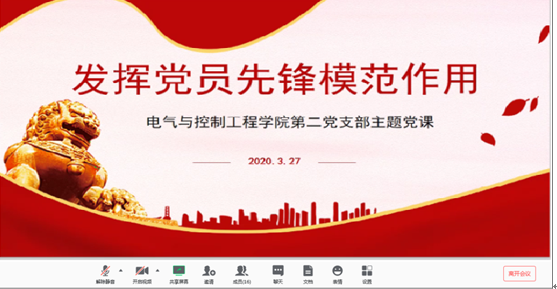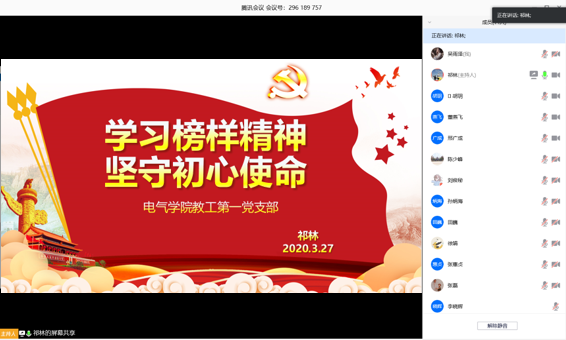 教工第一党支部书记祁林利用腾讯会议平台,为支部党员上了一节题为《学习榜样精神,坚守初心使命》的专题党课,校党委书记张惠贞、电气学院党总支书记董燕飞、副院长孙炳海以一名普通党员的身份参加了此次党课学习。祁林以“本色英雄”张富清、“吃亏”书记李连成、“扶贫之花”黄文秀等多名优秀党员的事迹为切入点,抛出在疫情防控这个特殊时期,“党员应拿什么致敬榜样”这个问题引导各同志结合自己工作进行更深层次的思考,并从宗旨信念、奉献精神、淡薄品性三个层面做了深入阐释。面对目前疫情的状况,祁林号召支部党员们要追随榜样、逆行而上,用榜样的力量涵养初心、用榜样的力量坚守初心、用榜样的力量践行初心。同时提醒大家作为党员教师,应该充分发挥先锋模范带头作用,教书育人兼行,既要认真准备线上课程,也要做好学生在疫情期间的心理健康疏导等工作,为这场战“疫”做出自己的努力。