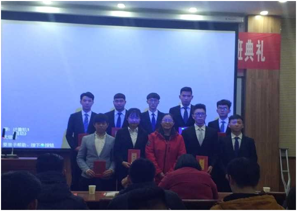 (图为董燕飞书记为第九届学生会主席团成员颁发聘书并合影留念)