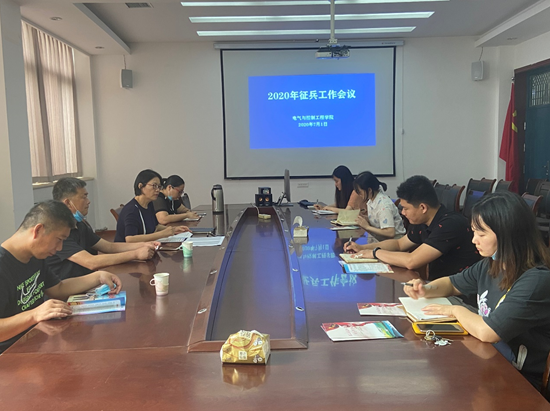 (通讯员 吴雨泽)为贯彻落实国家征兵工作决策部署,服务强军兴军宏伟战略,教育和引导大学生积极投身国防和军队建设。7月1日上午,电气学院2020年征兵工作推进会在二号教学楼B313会议室召开。校保卫处副处长褚清营、国防教育科副科长王艳杰应邀出席,学院党总支书记董燕飞、党总支副书记宁蕴绯、团总支副书记、学工办副主任徐娟和学院全体辅导员参加了会议。