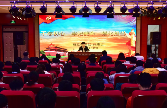 张惠贞以回顾党的伟大历史,深刻认识和理解初心使命的时代内涵为切入,指出中国共产党始终坚持以人民为中心,始终把为人民谋幸福作为初心,让人民群众不断有切切实实的获得感幸福感安全感,赢得了民心。随后她从世界科技文化发展的严峻挑战、超级大国单边主义的严峻挑战、新旧贸易保护主义的严峻挑战和敌对势力西化分化的严峻挑战四个方面分析了当今中国面临的重重挑战。她勉励同学们认真学习科学文化知识,提高自身创新意识,为祖国的发展贡献自己的力量。她强调新时代大学生要以理想信念引领历史使命,要以创新精神诠释责任担当。希望各位同学们在接下来的学习、工作中,不忘初心、牢记使命,为中华民族真正的伟大复兴贡献力量,实现个人价值。