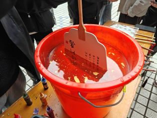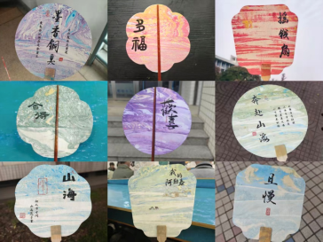 活动开始后,工作人员发放印有吉祥语的素面扇坯等材料,现场同学在专业人员指导下,小心翼翼地在水面点色、勾勒纹理,再将扇面缓缓入水,让独一无二的色彩与纹理自然吸附于扇面之上。原本素净的扇面逐渐绽放出独一无二的色彩与纹路,现场氛围专注而温馨。
