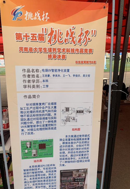 该赛事由共青团河南省委、河南省教育厅、河南省社会科学院、河南省科学科学技术协会、河南省学生联合会共同主办。本届竞赛于2020年10月正式启动,共有91所高校,2444件作品参加省级比赛,内容涉及机械控制、信息技术、生命科学、能源化工、社会经济、哲学法律、教育管理、军事数理等30多个专业和学科。最终共选拔出575件参赛作品,近5千人参加终审决赛。我院共3项作品获奖。李英杰、王一飞、王连豪等同学的作品《电袋UV智能净化装置》荣获河南省二等奖;李俊庆、晁文哲等同学的作品《“浮筒式水处理滤池”》获河南省三等奖;付俊豪、李梦阳等同学的作品《“智能物流搬运机器人”》获河南省三等奖。